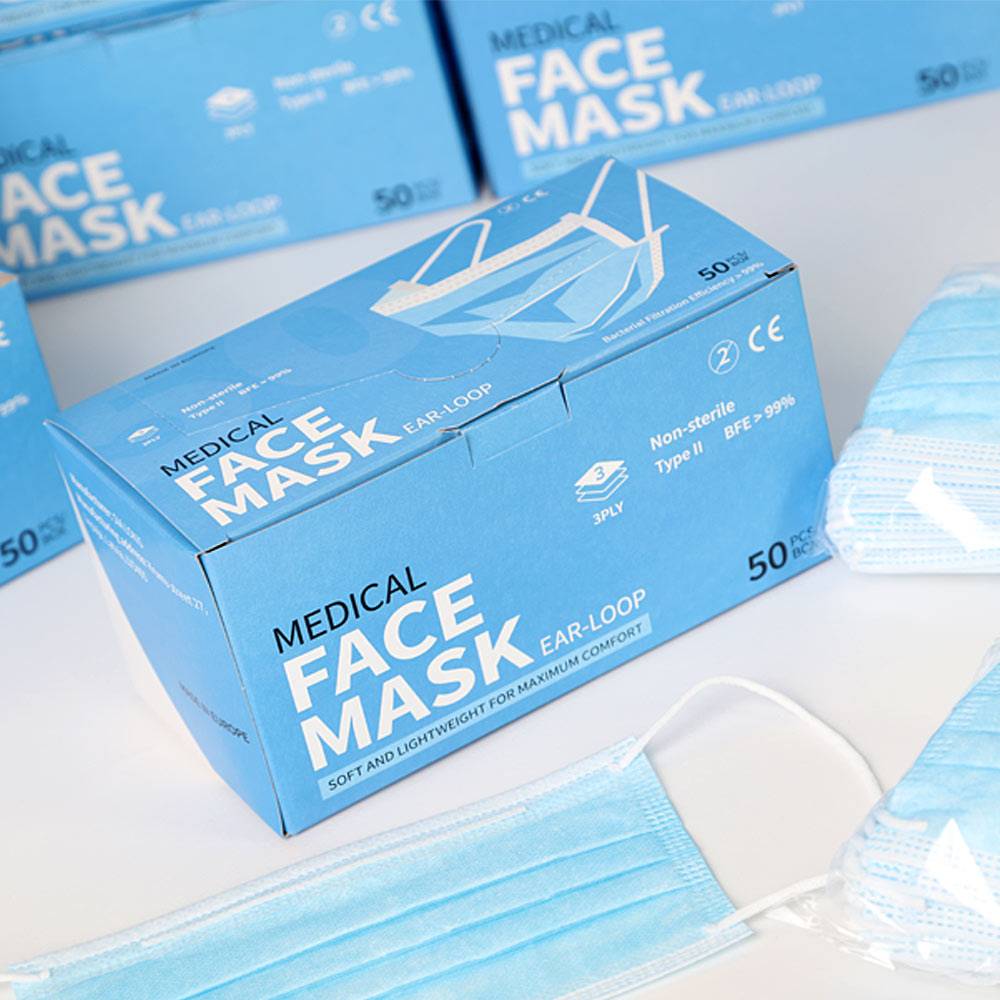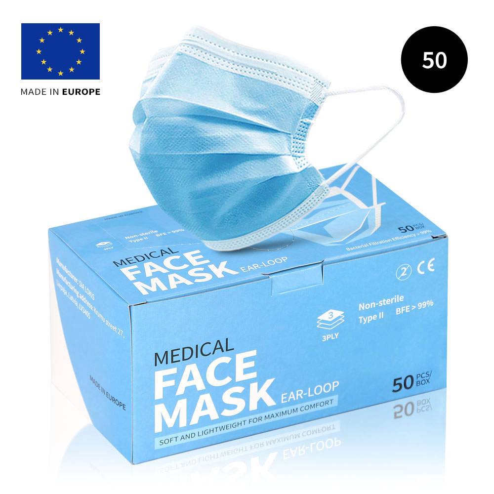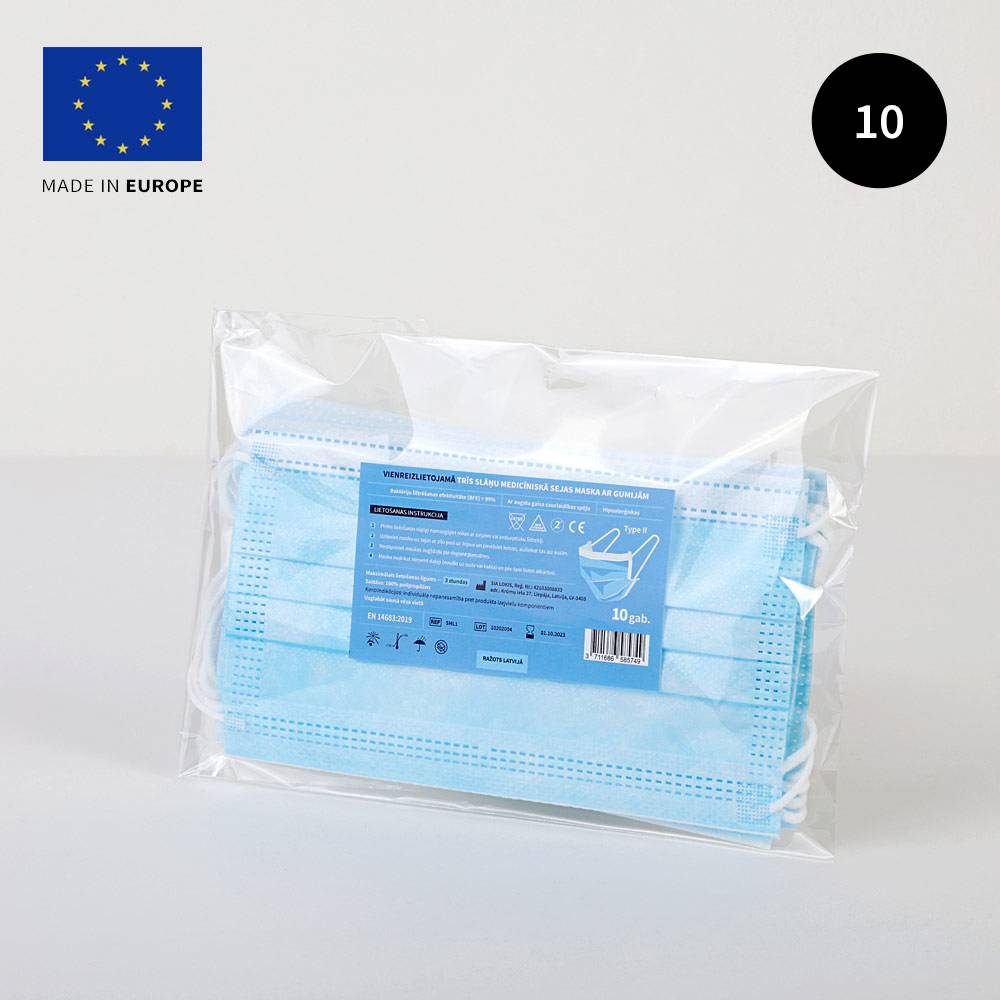 | Produkts: | Trīs slāņu medicīniskā sejas maska ar ausu cilpu un deguna saspraudi |